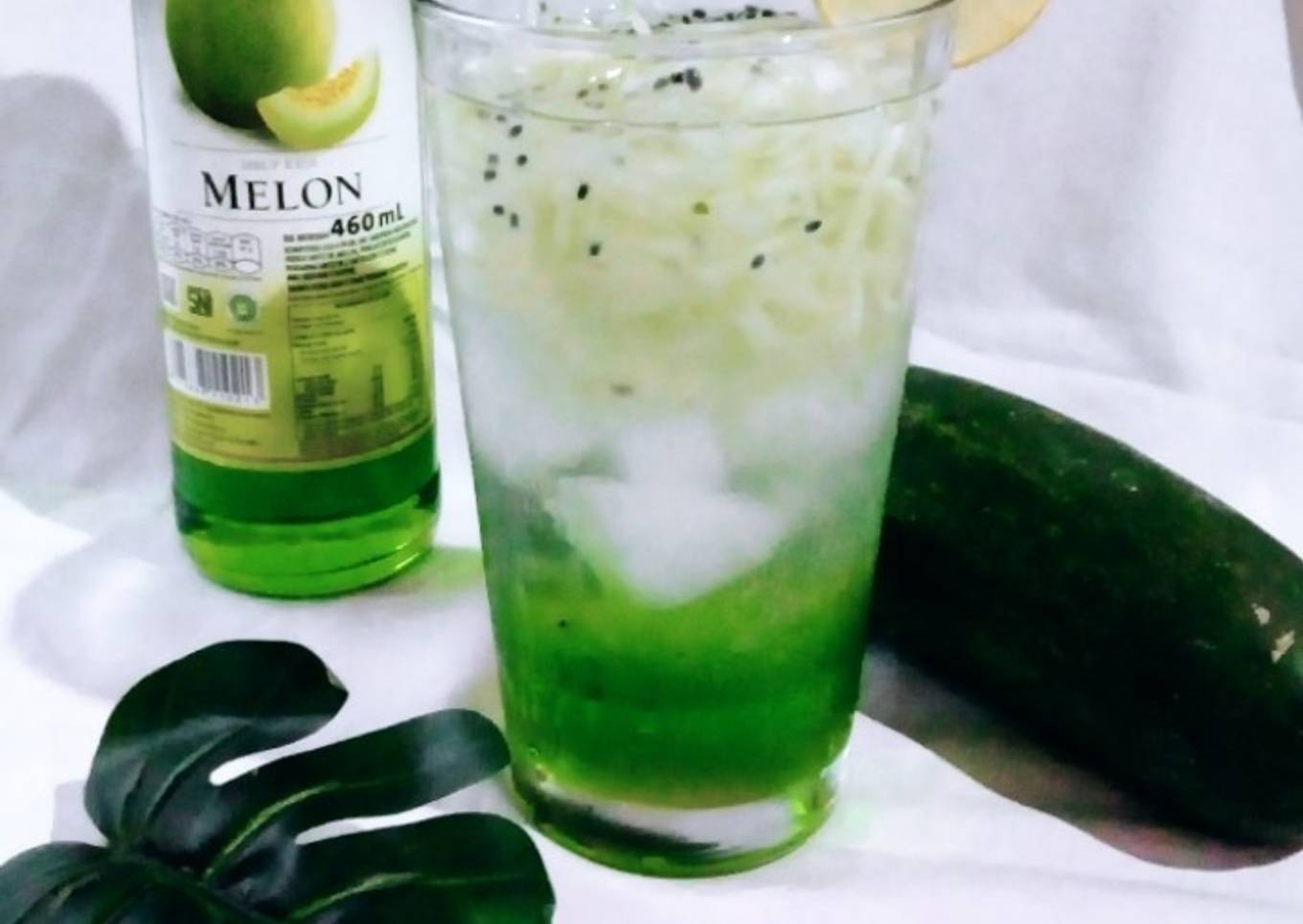 - Untuk penyajiannya, dalam gelas masukkan secukupnya sirup melon, tambahkan es batu, serutan timun, selasih, dan air sedikit-sedikit. Terakhir beri perasan air jeruk nipis.